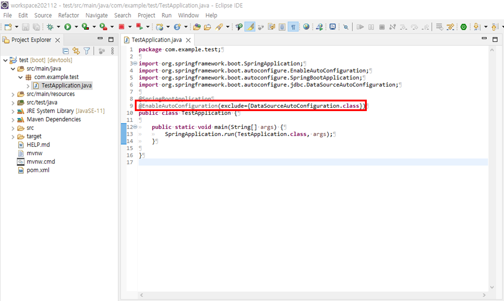 아직 db가 준비되지 않았다면, @EnableAutoConfiguration 어노테이션을 사용하는 방법도 있다.